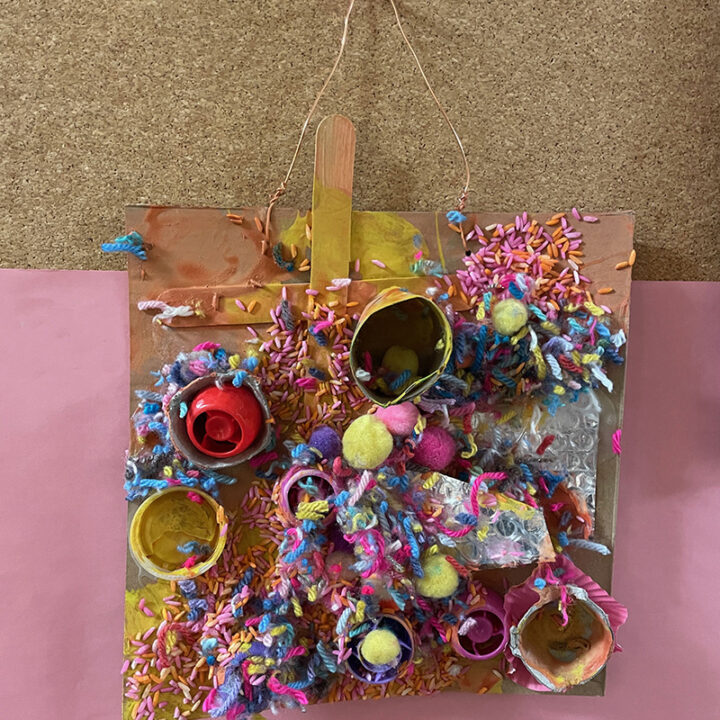 Gather a mix of recycled materials to make bright and colorful kids art. This project works great for a group activity, or can be used as an individual project that would look cute framed.